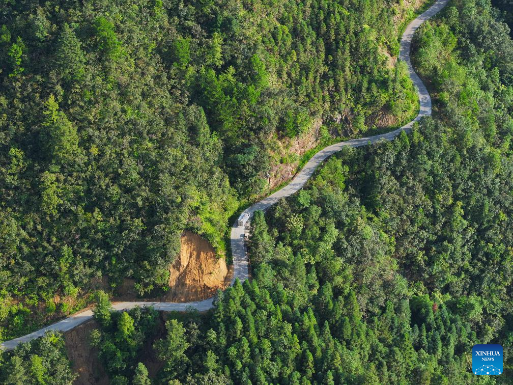 An aerial drone photo taken on Sept. 5, 2024 shows Liang Xiuqian driving a truck to deliver parcels on a mountain road on the border between south China's Guangxi Zhuang Autonomous Region and southwest China's Guizhou Province. (Xinhua/Huang Xiaobang)
