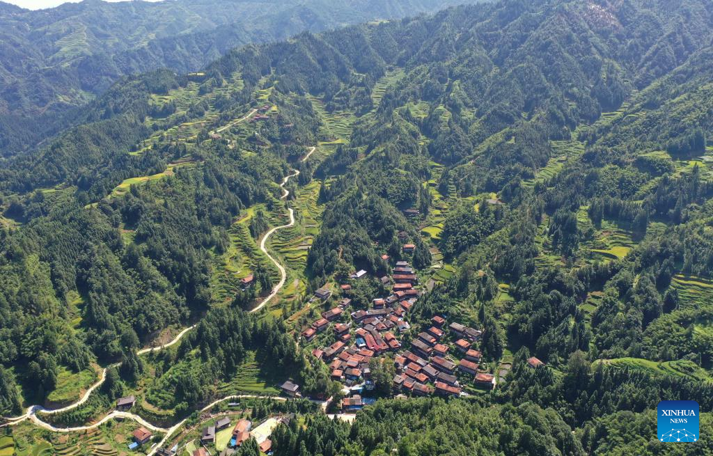 An aerial drone photo taken on Sept. 4, 2024 shows the Wuying Village on the border between south China's Guangxi Zhuang Autonomous Region and southwest China's Guizhou Province. (Xinhua/Jin Haoyuan)