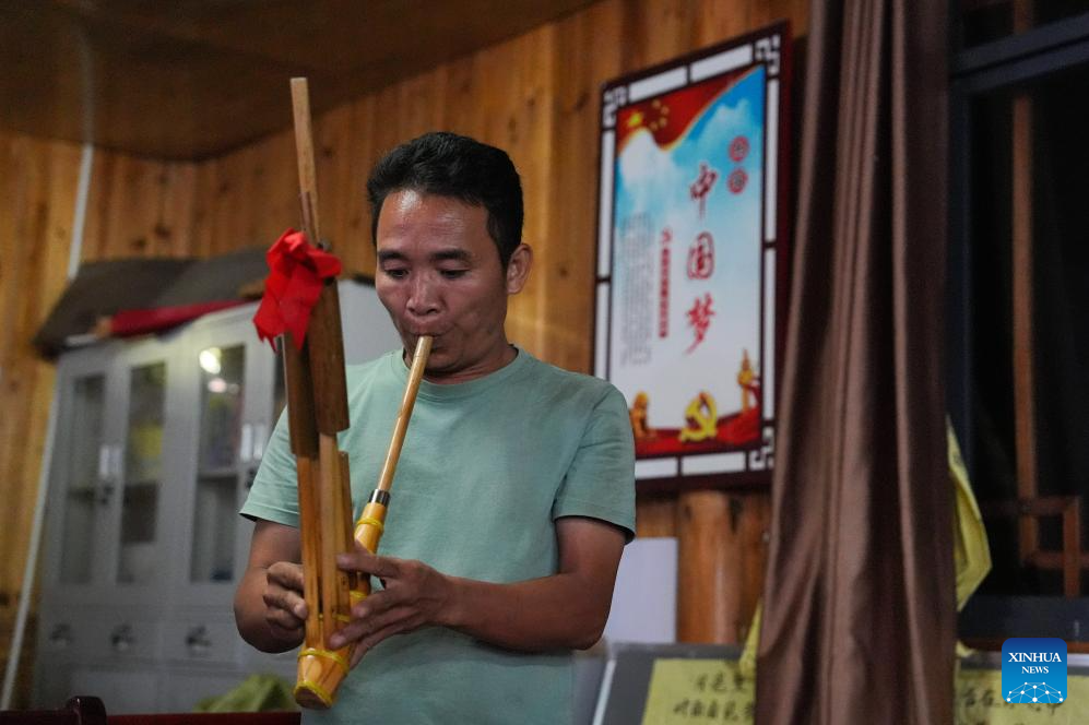 Liang Xiuqian prepares his Lusheng before a lecture at a night school at Wuying Village on the border between south China's Guangxi Zhuang Autonomous Region and southwest China's Guizhou Province, Sept. 10, 2024. (Xinhua/Zheng Huansong)