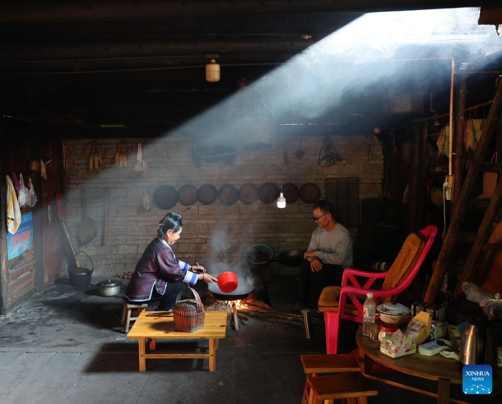Liang Anhe (R) and his wife Liang Yingmi prepare oil tea at home at Wuying Village on the border between south China's Guangxi Zhuang Autonomous Region and southwest China's Guizhou Province, Sept. 4, 2024. (Xinhua/Jin Haoyuan)