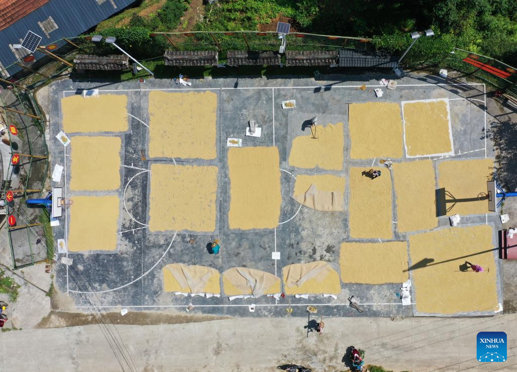 An aerial drone photo taken Sept. 4, 2024 shows villagers airing rice at a basketball court at Wuying Village on the border between south China's Guangxi Zhuang Autonomous Region and southwest China's Guizhou Province. (Xinhua/Jin Haoyuan)