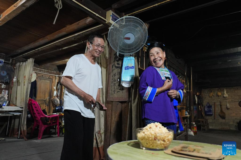 Liang Anhe (L) and his wife Liang Yingmi chat at home at Wuying Village on the border between south China's Guangxi Zhuang Autonomous Region and southwest China's Guizhou Province, Sept. 10, 2024. (Xinhua/Zheng Huansong)