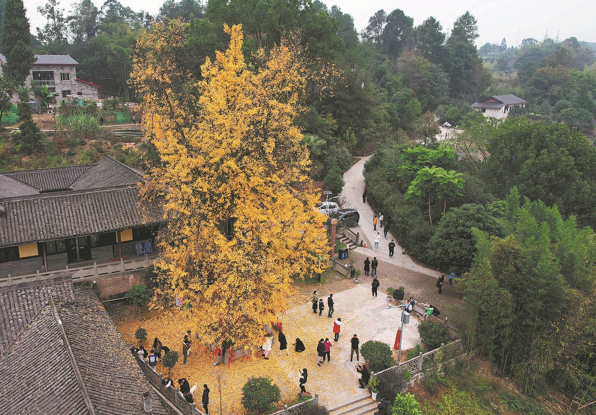 A 1,200-year-old ginkgo tree draws tourists to Tianxin Temple in Banan district, Chongqing, in December 2022. ZHOU YI/CHINA NEWS SERVICE