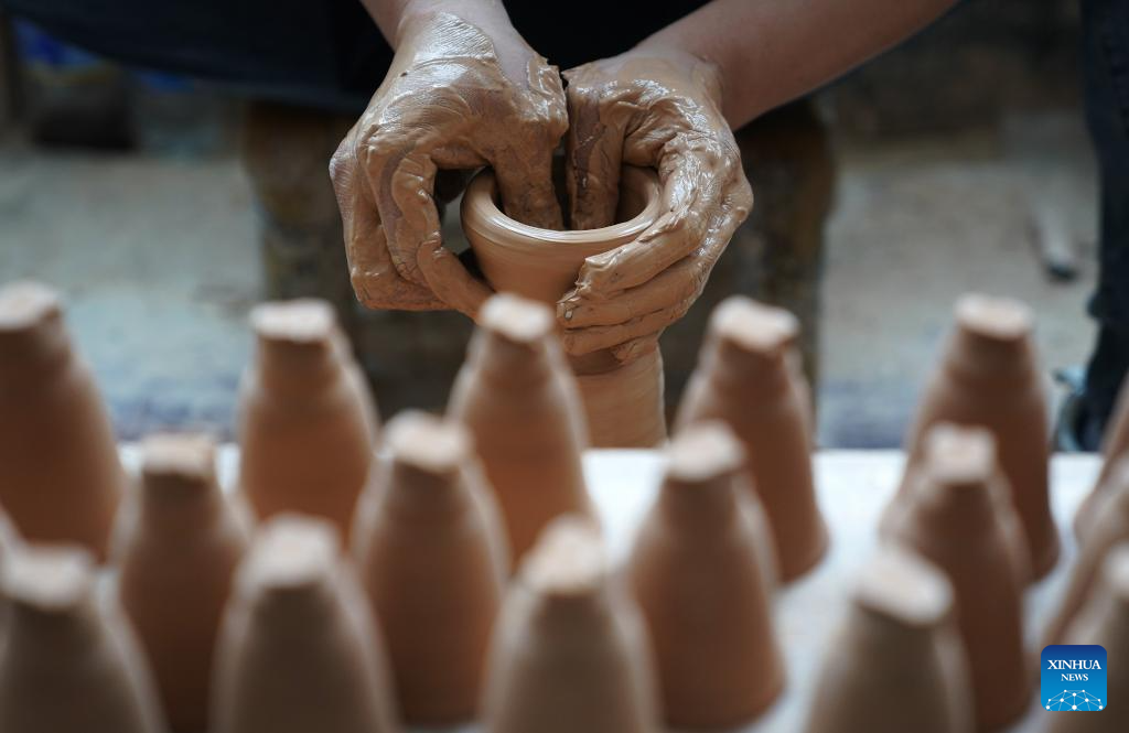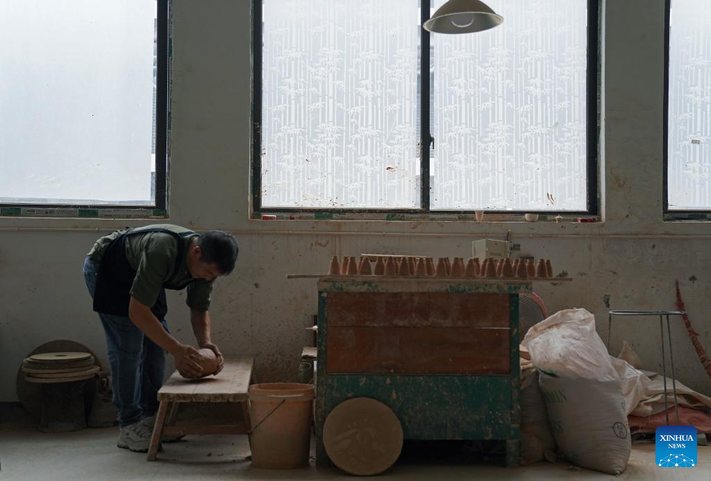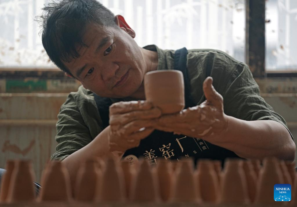 Li Shanming molds clay at his workshop in Jingdezhen, east China's Jiangxi Province, Aug. 28, 2024. (Xinhua/Wan Xiang)