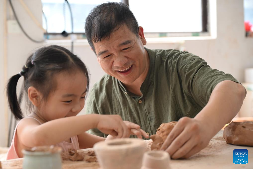 Li Shanming (R) plays with his daughter at his workshop in Jingdezhen, east China's Jiangxi Province, Aug. 28, 2024. (Xinhua/Sui Shangjun)
