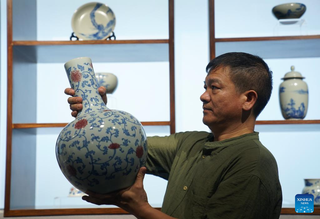 Li Shanming gazes at a Ru porcelain artwork at the exhibition area of his workshop in Jingdezhen, east China's Jiangxi Province, Aug. 28, 2024.(Xinhua/Wan Xiang)