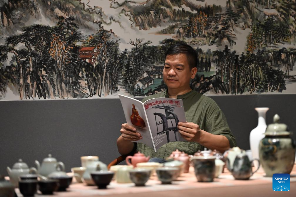 Li Shanming reads a magazine at the studio of his workshop in Jingdezhen, east China's Jiangxi Province, Aug. 28, 2024.(Xinhua/Sui Shangjun)