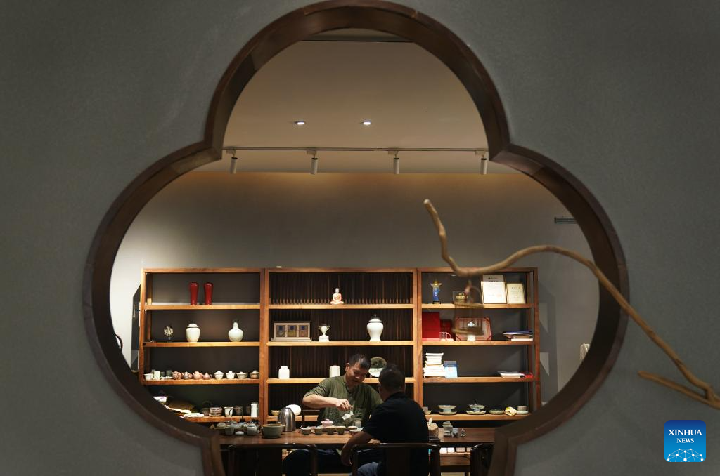Li Shanming (L) uses a self-made Ru porcelain tea set to drink tea with his friend at the exhibition area of his workshop in Jingdezhen, east China's Jiangxi Province, Aug. 28, 2024. (Xinhua/Wan Xiang)