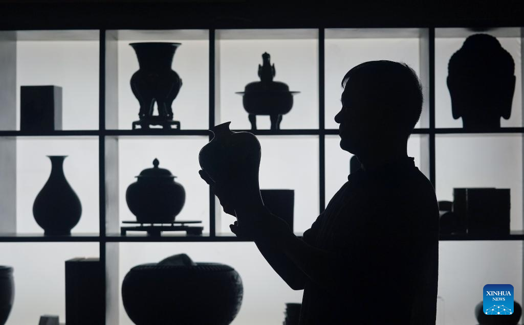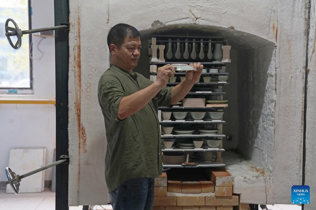 Li Shanming checks the condition of Ru porcelain products at his workshop in Jingdezhen, east China's Jiangxi Province, Aug. 28, 2024. (Xinhua/Sui Shangjun)