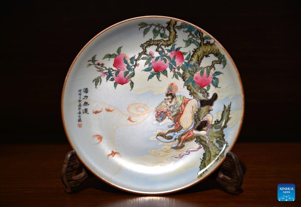 A Ru porcelain artwork of Li Shanming, themed on classic Chinese novel "Journey to the West," is seen at the exhibition area of his workshop in Jingdezhen, east China's Jiangxi Province, Aug. 28, 2024. (Xinhua/Sui Shangjun)