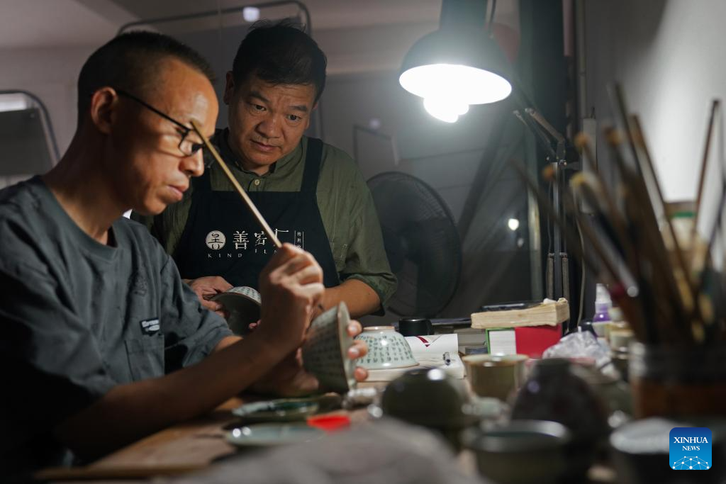 Li Shanming (R) communicates drawing techniques with a ceramic painter at his workshop in Jingdezhen, east China's Jiangxi Province, Aug. 28, 2024. (Xinhua/Wan Xiang)