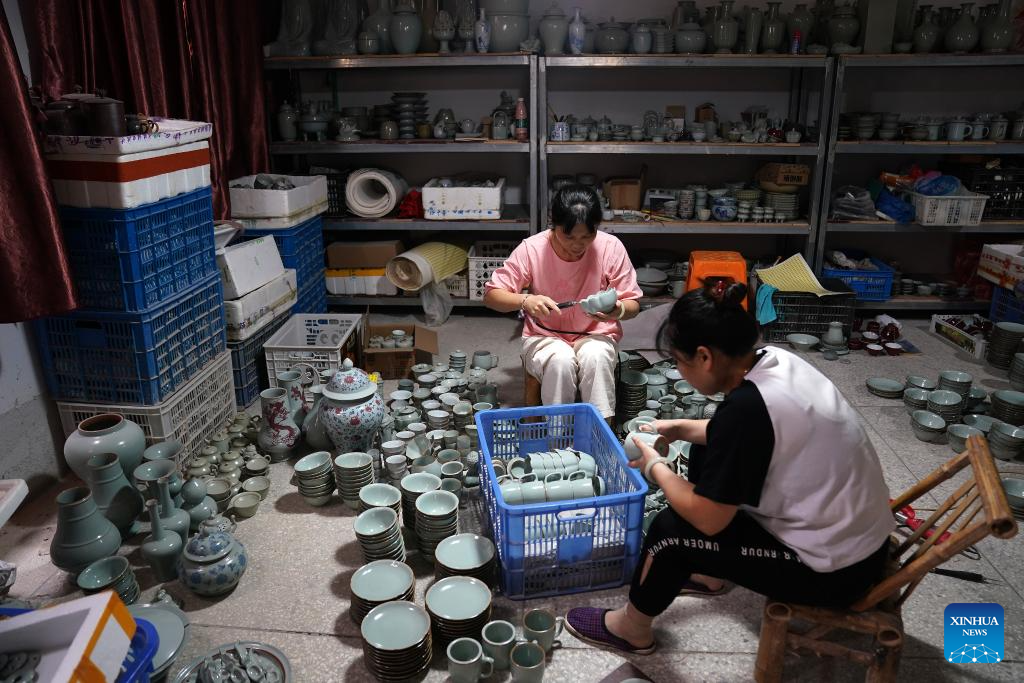 Workers check the quality of Ru porcelain products at the workshop of Li Shanming in Jingdezhen, east China's Jiangxi Province, Aug. 28, 2024.(Xinhua/Wan Xiang)