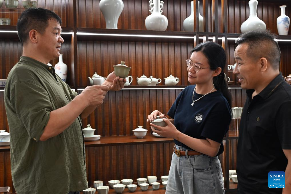 Li Shanming (1st L) introduces Ru porcelain products to visitors at the exhibition area of his workshop in Jingdezhen, east China's Jiangxi Province, Aug. 28, 2024.(Xinhua/Sui Shangjun)