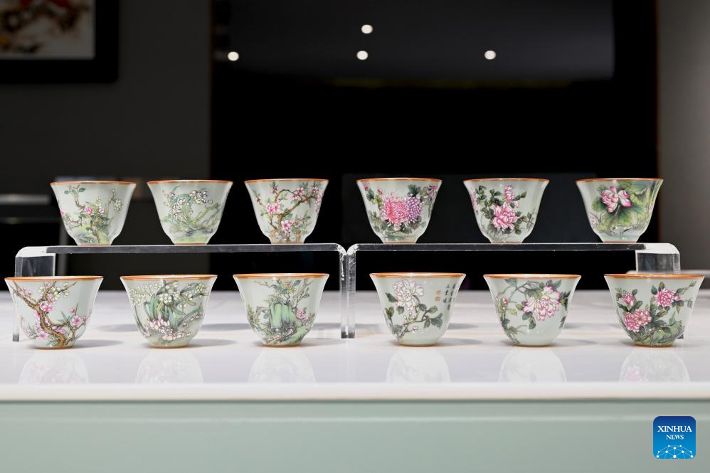 A set of Ru porcelain artworks of Li Shanming, themed on twelve different flowers, is seen at the exhibition area of his workshop in Jingdezhen, east China's Jiangxi Province, Aug. 28, 2024. (Xinhua/Sui Shangjun)