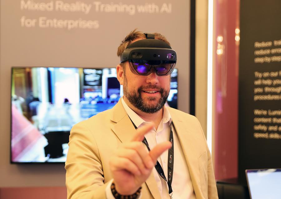 A staff member controls AI glasses of mixed-reality training for enterprises during the third edition of the Global AI Summit in Riyadh, Saudi Arabia, Sept. 10, 2024. (Xinhua/Wang Dongzhen)