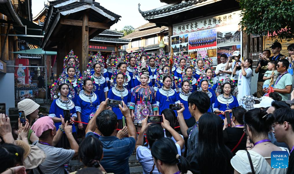 Tourists enjoy folk customs performance of the Dong ethnic group in Chengyang Eight Villages in Sanjiang Dong Autonomous County, south China's Guangxi Zhuang Autonomous Region, Aug. 28, 2024.(Xinhua/Zhang Ailin)