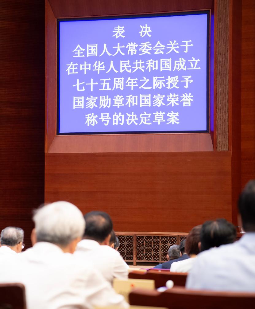 They also adopted a decision on conferring national medals and honorary titles on the occasion of the 75th anniversary of the founding of the People's Republic of China, and a decision on removing Tang Renjian from the post of minister of agriculture and rural affairs and appointing Han Jun to the position.