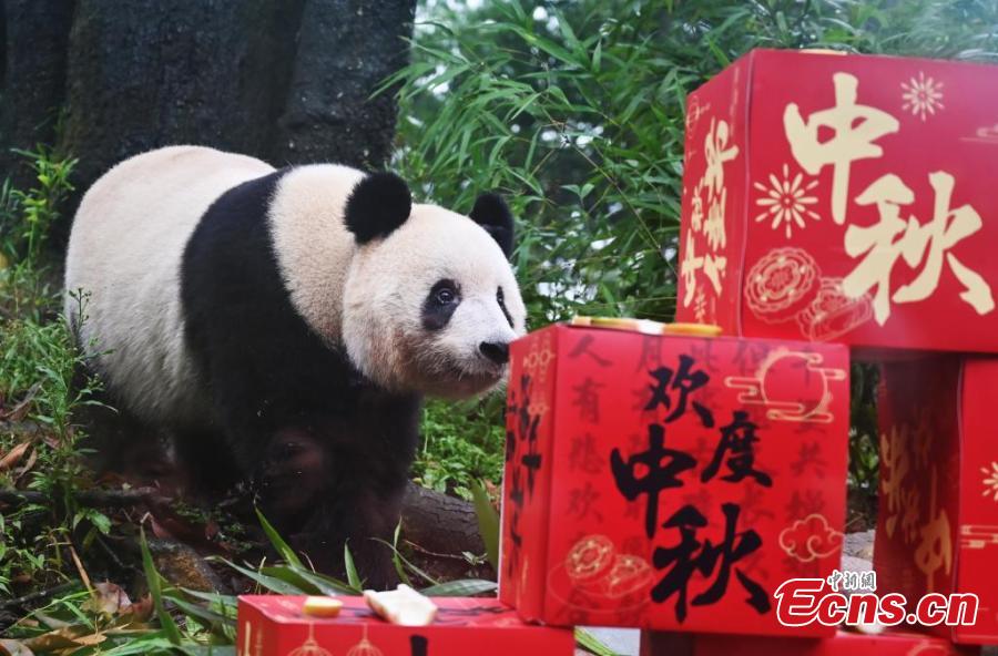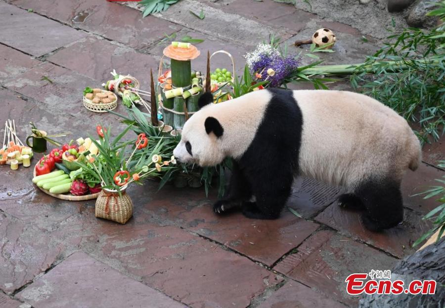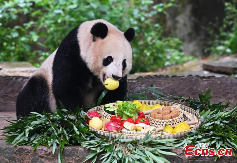 A giant panda enjoys bamboo shoots during a group birthday party at the Bifengxia Giant Panda Base in Ya'an, southwest China's Sichuan Province, Sept. 13, 2024. (Photo: China News Service/An Yuan)