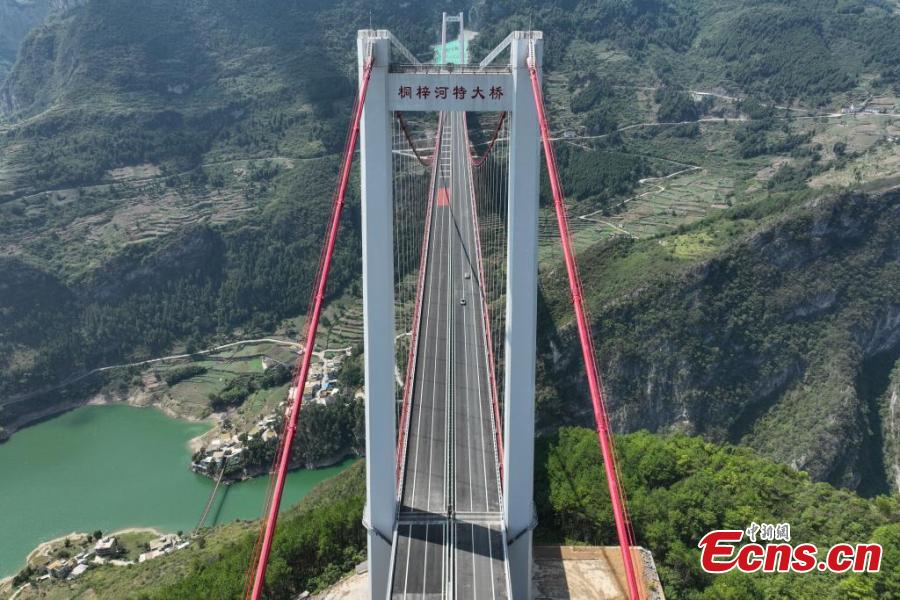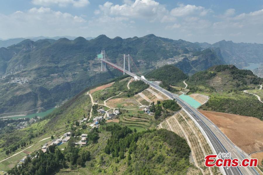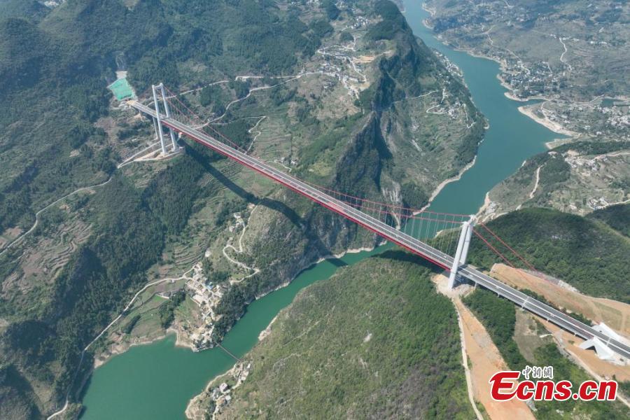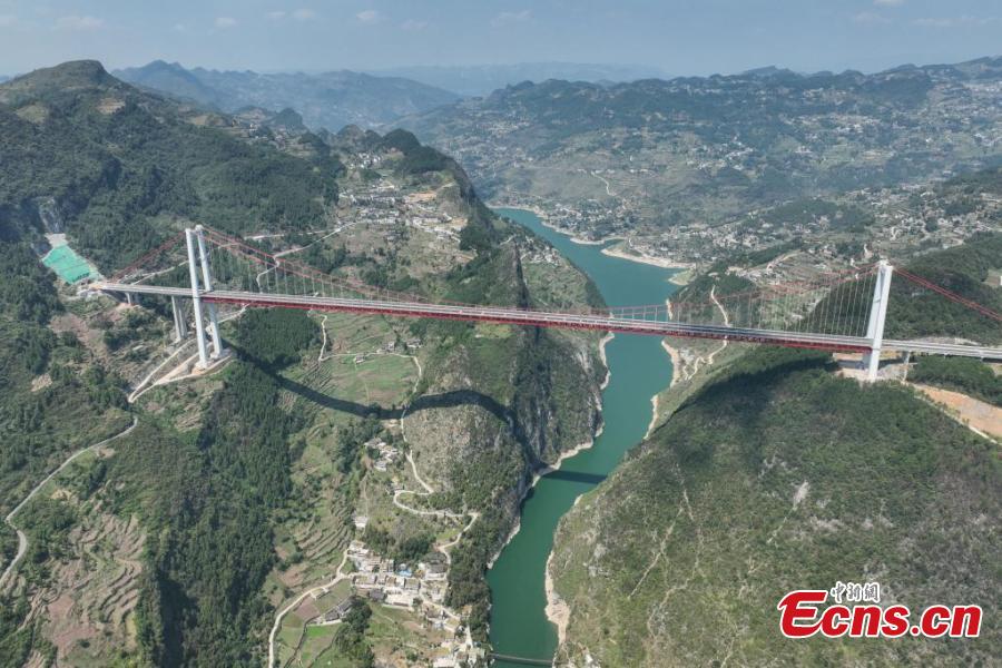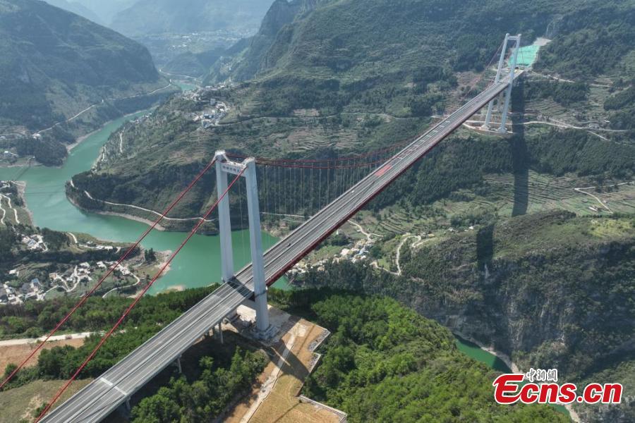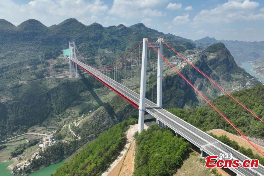 Spanning 965 meters, the 1,422-meter-long bridge with the main tower of 208 meters high is an important part of the Jinsha-Renhuai-Tongzi highway.
