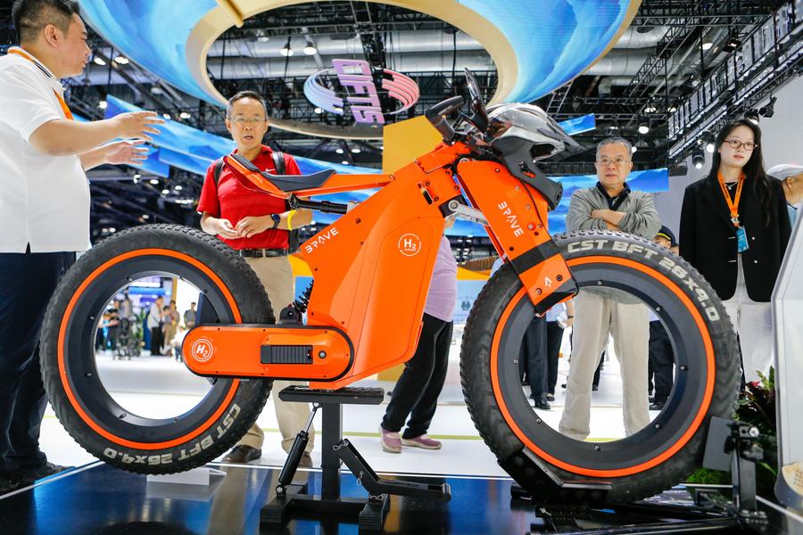 People look at a hydrogen-powered motorcycle displayed during the 2024 China International Fair for Trade in Services (CIFTIS) at the China National Convention Center in Beijing, capital of China, Sept. 13, 2024. (Xinhua/Ding Hongfa)