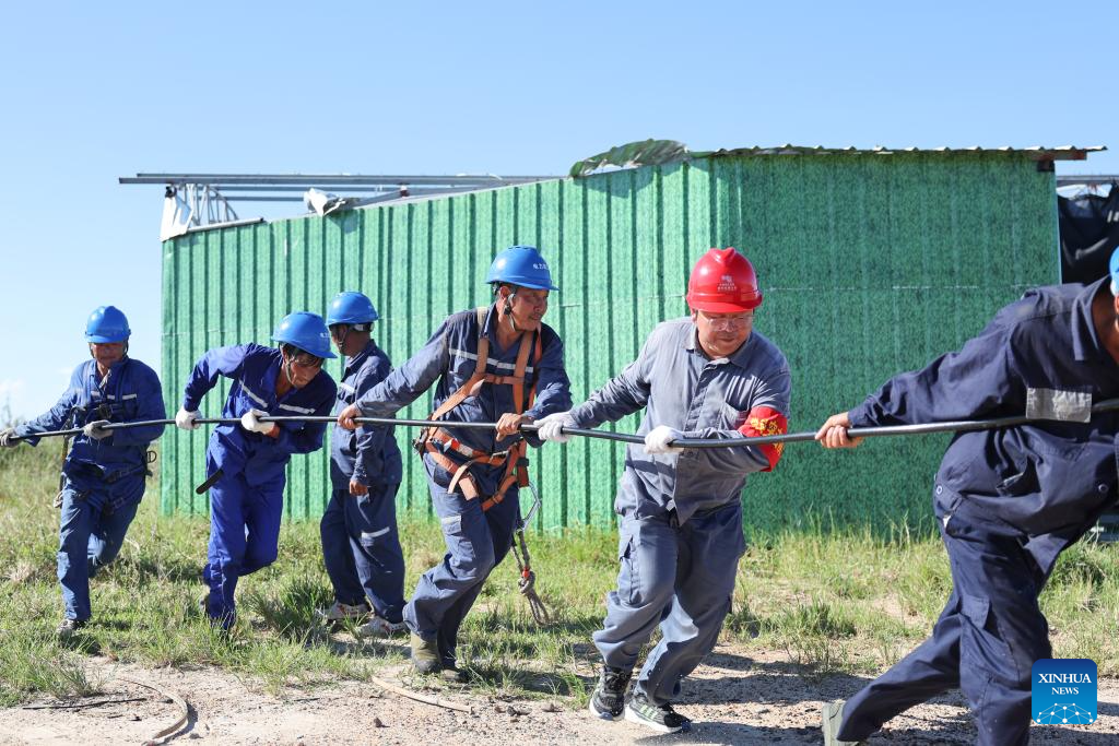 Maintenance workers Chen Hongfei (front) and Li Bing test a safety belt before climbing up an electrical wire pole in Longlou Township of Wenchang City, south China's Hainan Province, Sept. 13, 2024. Due to the impact of Super Typhoon Yagi, power facilities were damaged in different places in Hainan in the past few days.