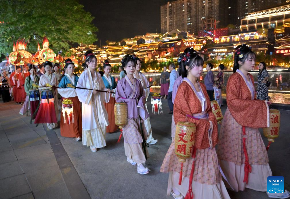 People dressed in antique Chinese costumes attend a parade in Xuan'en County, central China's Hubei Province, Sept. 16, 2024. Chinese enjoyed a three-day holiday for the Mid-Autumn Festival, which fell on Sept. 17 this year. (Photo by Song Wen/Xinhua)