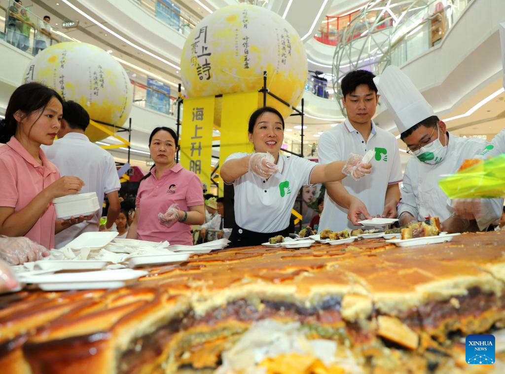 Staff members of a shopping center distribute mooncakes to tourists in Nanyang, central China's Henan Province, Sept. 17, 2024. Chinese enjoyed a three-day holiday for the Mid-Autumn Festival, which fell on Sept. 17 this year. (Photo by Gao Song/Xinhua)