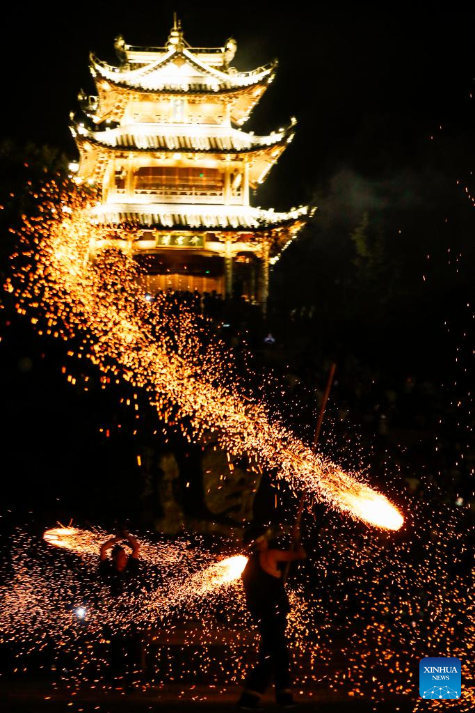 Folk artists perform carbon flower dance, creating sparks by burning charcoal, for tourists in Xiuning County, Huangshan City, east China's Anhui Province, Sept. 16, 2024. Chinese enjoyed a three-day holiday for the Mid-Autumn Festival, which fell on Sept. 17 this year. (Photo by Shi Yalei/Xinhua)