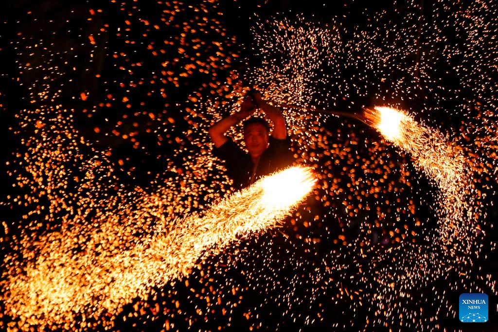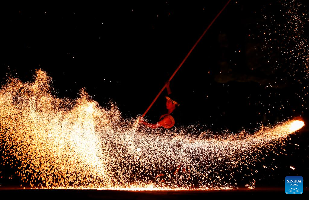 A folk artist performs carbon flower dance, creating sparks by burning charcoal, for tourists in Xiuning County, Huangshan City, east China's Anhui Province, Sept. 16, 2024. Chinese enjoyed a three-day holiday for the Mid-Autumn Festival, which fell on Sept. 17 this year. (Photo by Shi Yalei/Xinhua)