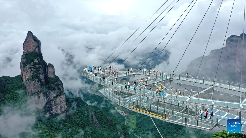 An aerial drone photo taken on Sept. 17, 2024 shows tourists visiting the Shenxianju scenery spot in Taizhou, east China's Zhejiang Province. Chinese enjoyed a three-day holiday for the Mid-Autumn Festival, which fell on Sept. 17 this year. (Photo by Wang Huabin/Xinhua)