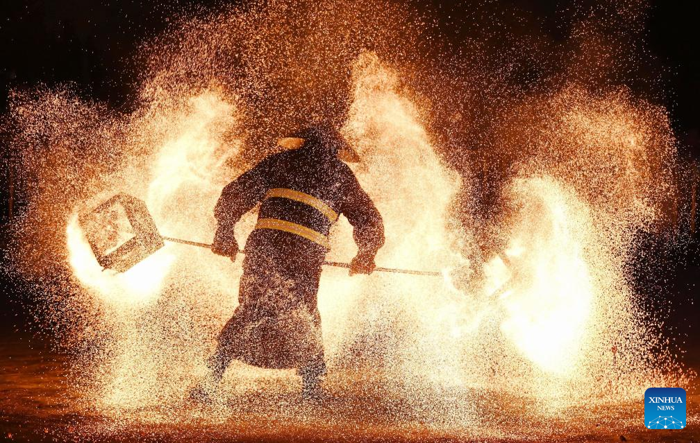 Folk artists throw molten iron to create fireworks for tourists in Tangshan, north China's Hebei Province, Sept. 16, 2024. Chinese enjoyed a three-day holiday for the Mid-Autumn Festival, which fell on Sept. 17 this year. (Photo by Liu Mancang/Xinhua)