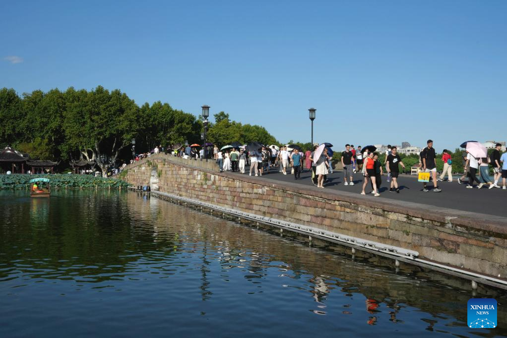 Tourists walk on Duanqiao Bridge (Broken Bridge) in the West Lake scenic area in Hangzhou, capital of east China's Zhejiang Province, Sept. 17, 2024. Chinese enjoyed a three-day holiday for the Mid-Autumn Festival, which fell on Sept. 17 this year. (Xinhua/Han Chuanhao)