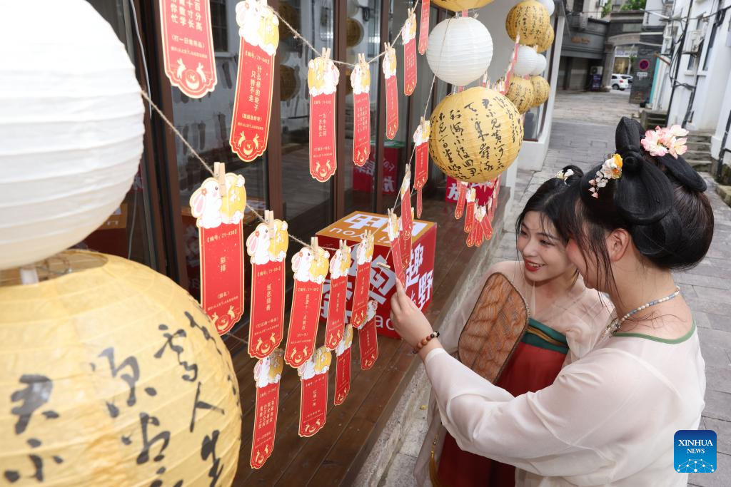 Tourists read lantern riddles in Qianyuan Town of Deqing County in Huzhou City, east China's Zhejiang Province, Sept. 17, 2024. Chinese enjoyed a three-day holiday for the Mid-Autumn Festival, which fell on Sept. 17 this year. (Photo by Ni Lifang/Xinhua)