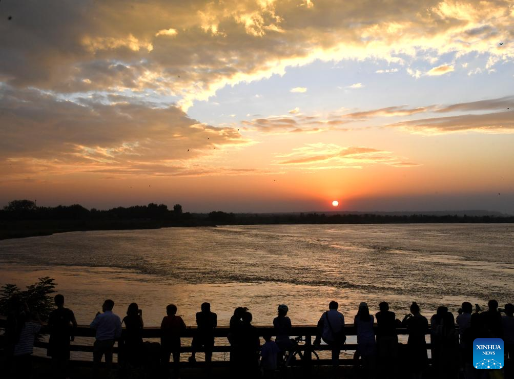 Tourists enjoy the sunset scenery at a park in Zhengzhou, central China's Henan Province, Sept. 17, 2024. Chinese enjoyed a three-day holiday for the Mid-Autumn Festival, which fell on Sept. 17 this year. (Photo by Zhou Yong/Xinhua)