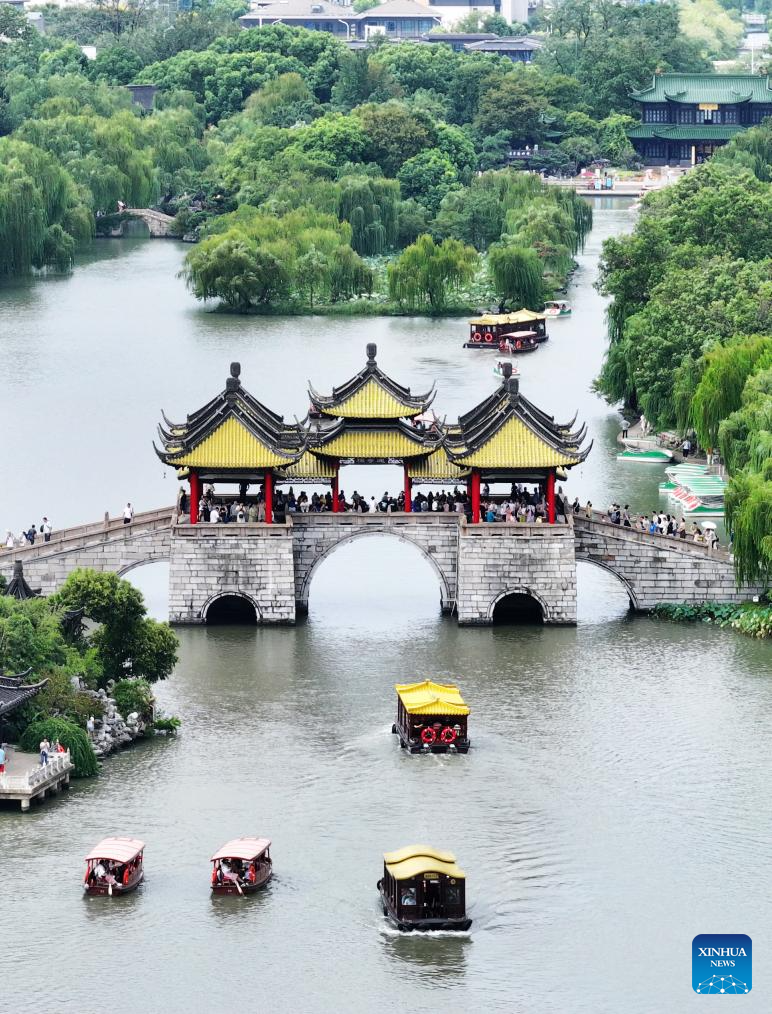 An aerial drone photo shows tourists visiting the Slender West Lake scenic spot in Yangzhou, east China's Jiangsu Province, Sept. 17, 2024. Chinese enjoyed a three-day holiday for the Mid-Autumn Festival, which fell on Sept. 17 this year. (Photo by Meng Delong/Xinhua)