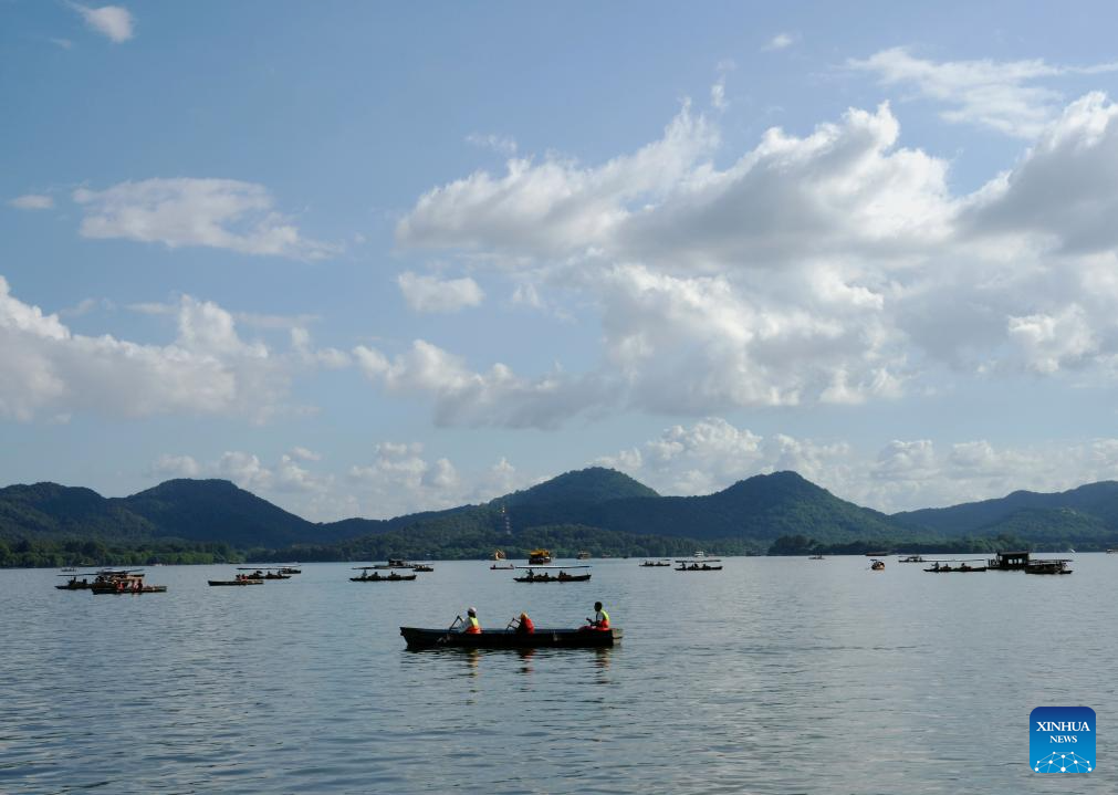 Tourists take boat tours on the West Lake scenic area in Hangzhou, capital of east China's Zhejiang Province, Sept. 17, 2024. Chinese enjoyed a three-day holiday for the Mid-Autumn Festival, which fell on Sept. 17 this year. (Xinhua/Han Chuanhao)