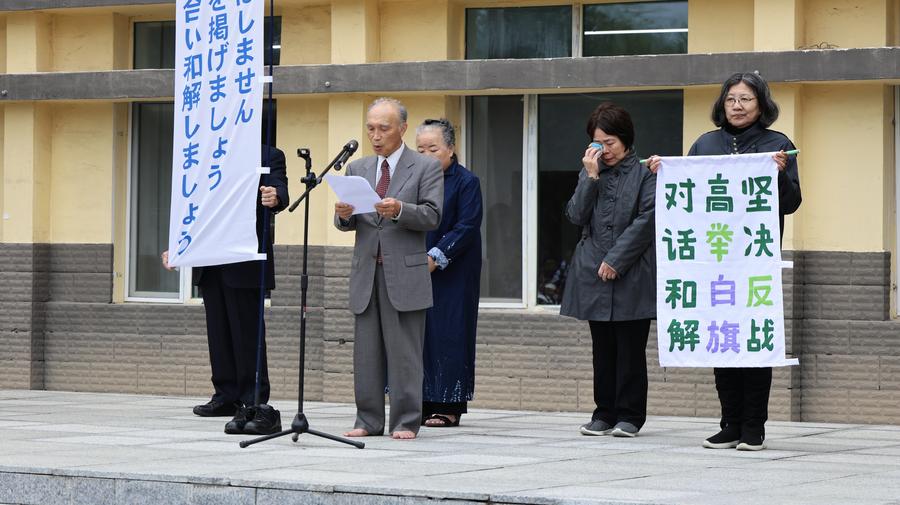 While they apologized at the site, the group members held white flags with characters that read "white flags against war, reconciliation through dialogue" in a poignant act of calling on the international community to remember history and cherish peace.