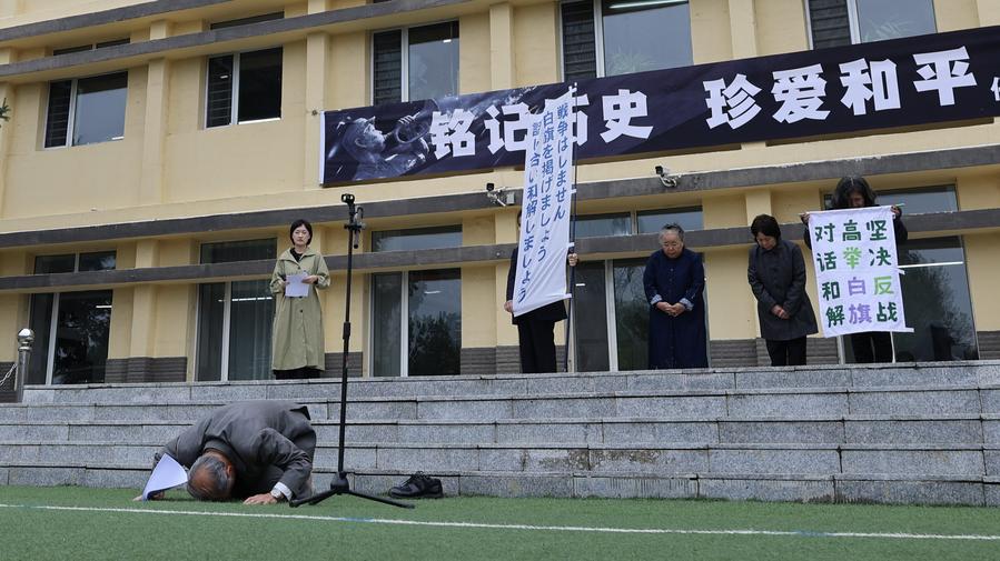 CHANGCHUN, Sept. 17 (Xinhua) -- Under the Chinese national flag, 76-year-old Japanese man Kuroi Akio removed his shoes and socks and knelt down to kowtow before the Chinese people. In this way he sought to offer an apology on behalf of his father at a historical site in northeast China's Jilin Province, where Japanese forces once committed atrocities during the invasion of China.