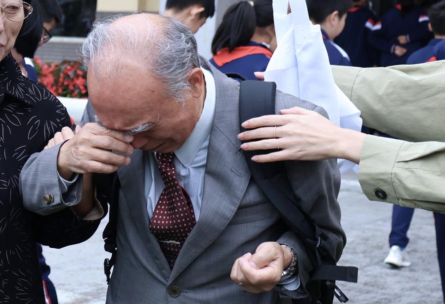 Kuroi Akio, descendant of WWII Japanese invader Kuroi Keijirou, cries after attending an apology ceremony in Gongzhuling, northeast China's Jilin Province, Sept. 14, 2024. (Photo by Tang Mingze/Xinhua)