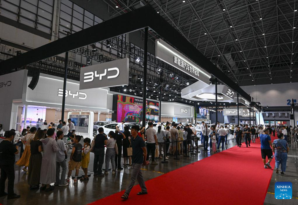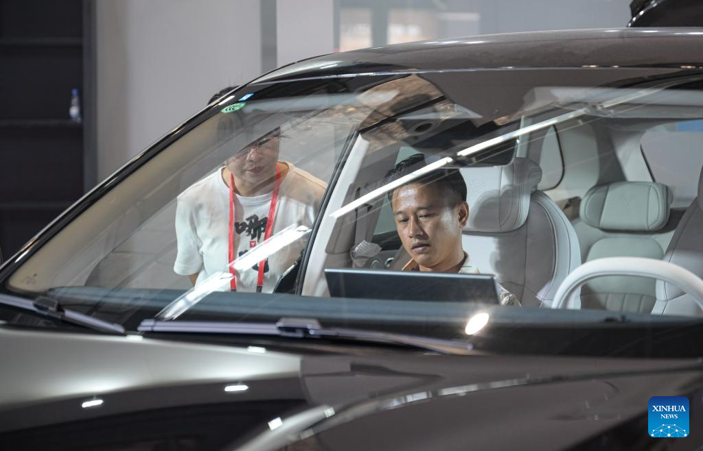 People visit the 2024 Hainan Autumn Auto Show in Hainan International Conference and Exhibition Center in Haikou, capital of south China's Hainan Province, Sept. 16, 2024. The show was held from Sept. 13 to 16, with nearly one hundred car manufacturers showcasing their products on a display area of more than 50,000 square meters. About 70 percent of the exhibited vehicles were new energy vehicles. (Xinhua/Pu Xiaoxu)