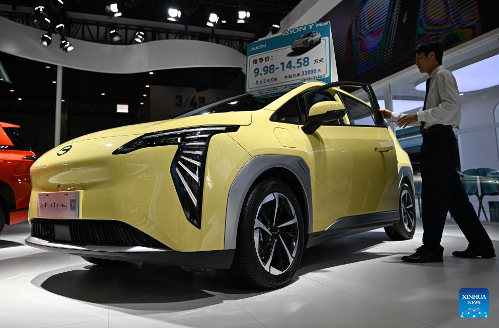 A GAC Aion Y Plus car is seen at the 2024 Hainan Autumn Auto Show in Hainan International Conference and Exhibition Center in Haikou, capital of south China's Hainan Province, Sept. 16, 2024. The show was held from Sept. 13 to 16, with nearly one hundred car manufacturers showcasing their products on a display area of more than 50,000 square meters. About 70 percent of the exhibited vehicles were new energy vehicles. (Xinhua/Pu Xiaoxu)