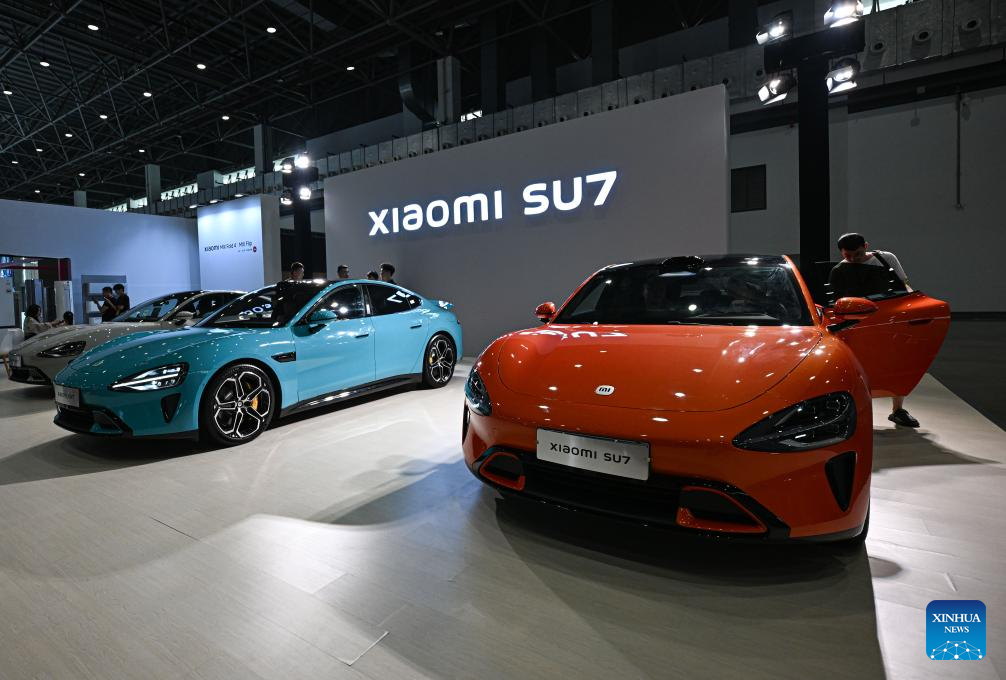 Xiaomi SU7 cars are displayed during the 2024 Hainan Autumn Auto Show in Hainan International Conference and Exhibition Center in Haikou, capital of south China's Hainan Province, Sept. 16, 2024. The show was held from Sept. 13 to 16, with nearly one hundred car manufacturers showcasing their products on a display area of more than 50,000 square meters. About 70 percent of the exhibited vehicles were new energy vehicles. (Xinhua/Pu Xiaoxu)