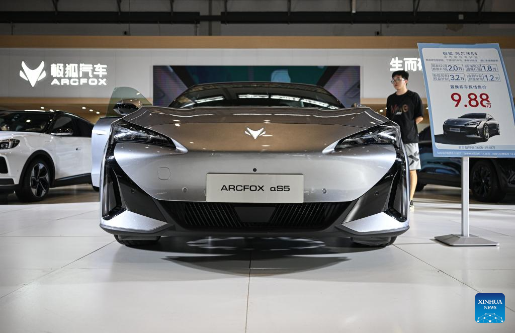 A Arcfox Alpha S5 car is seen at the 2024 Hainan Autumn Auto Show in Hainan International Conference and Exhibition Center in Haikou, capital of south China's Hainan Province, Sept. 16, 2024. The show was held from Sept. 13 to 16, with nearly one hundred car manufacturers showcasing their products on a display area of more than 50,000 square meters. About 70 percent of the exhibited vehicles were new energy vehicles. (Xinhua/Pu Xiaoxu)