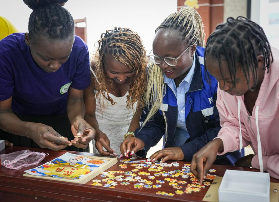 People do a jigsaw puzzle during a Mid-Autumn Festival celebration in Nairobi, Kenya, on Sept. 13, 2024. Africa Star Railway Operation Company (Afristar), the operator of Kenya's Standard Gauge Railway (SGR), and the Confucius Institute at the University of Nairobi, Kenya's oldest university, on Friday partnered to host the upcoming Mid-Autumn Festival, one of China's most important traditional holidays. (Xinhua/Li Yahui)