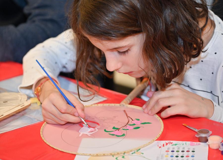 A girl paints on a fan during a celebration of the upcoming Mid-Autumn Festival at the Chinese Cultural Center in Berlin, Germany, Sept. 14, 2024. (Xinhua/Ren Pengfei)