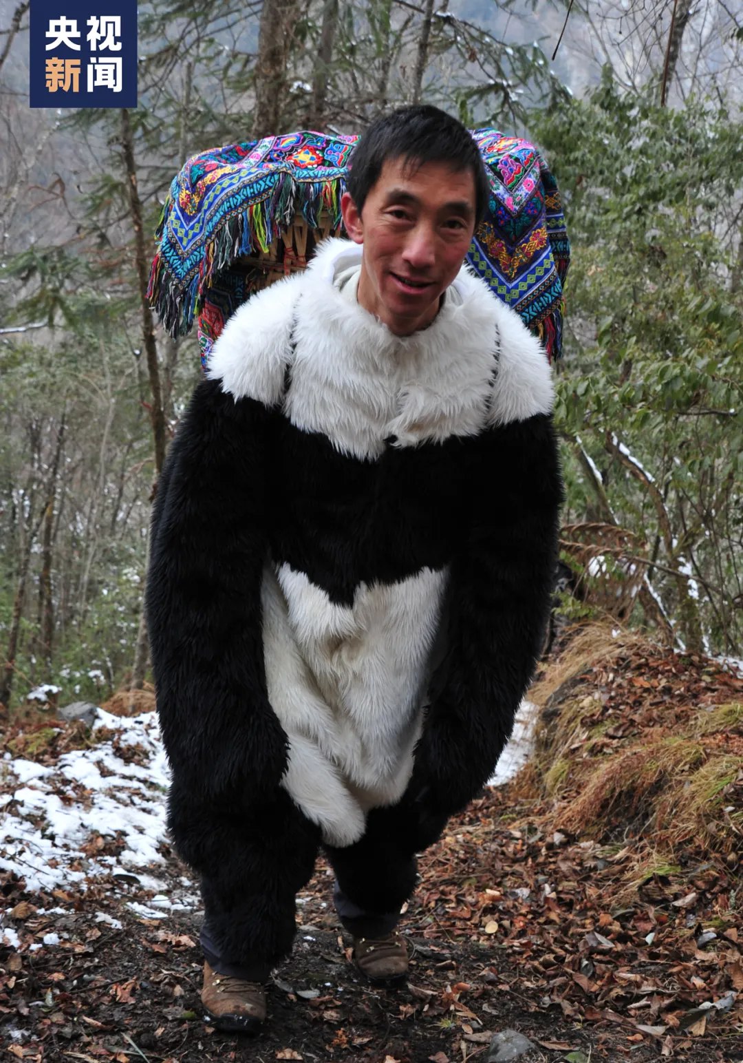 Mou Shijie, a giant panda keeper at the China Conservation and Research Center for the Giant Panda, patrols in the wild in disguise of a giant panda to monitor a giant panda cub undergoing rewilding training. (Photo/CCTV News)