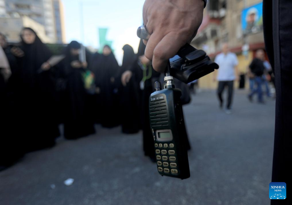 Photo taken on Sept. 18, 2024 shows a wireless communication device in the hand of a Hezbollah member, the battery of which was removed after a wireless communication device exploded during a funeral, in Beirut, Lebanon. (Xinhua/Bilal Jawich)