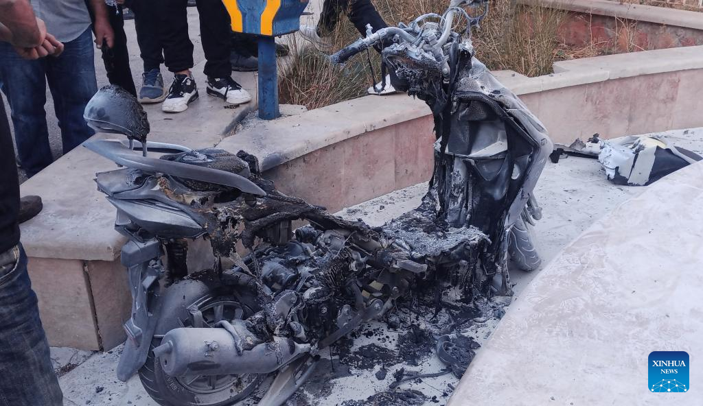 Photo taken on Sept. 18, 2024 shows a motorcycle damaged in explosions of communication devices in Baalbek, Lebanon. (Photo by Taher Abu Hamdan/Xinhua)