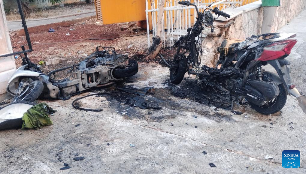 Photo taken on Sept. 18, 2024 shows motorcycles damaged in explosions of communication devices in Baalbek, Lebanon. (Photo by Taher Abu Hamdan/Xinhua)