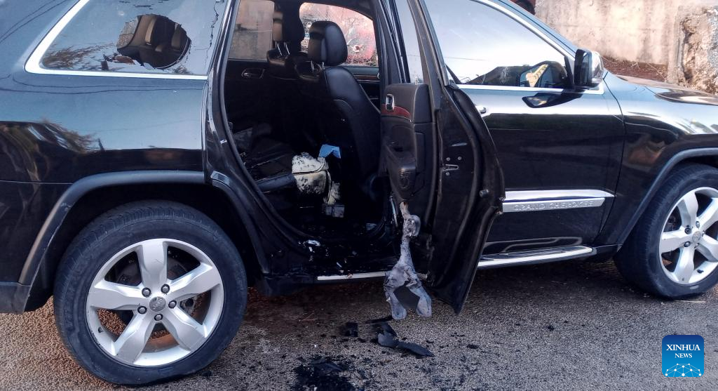 Photo taken on Sept. 18, 2024 shows a vehicle damaged in explosions of communication devices in Baalbek, Lebanon. (Photo by Taher Abu Hamdan/Xinhua)